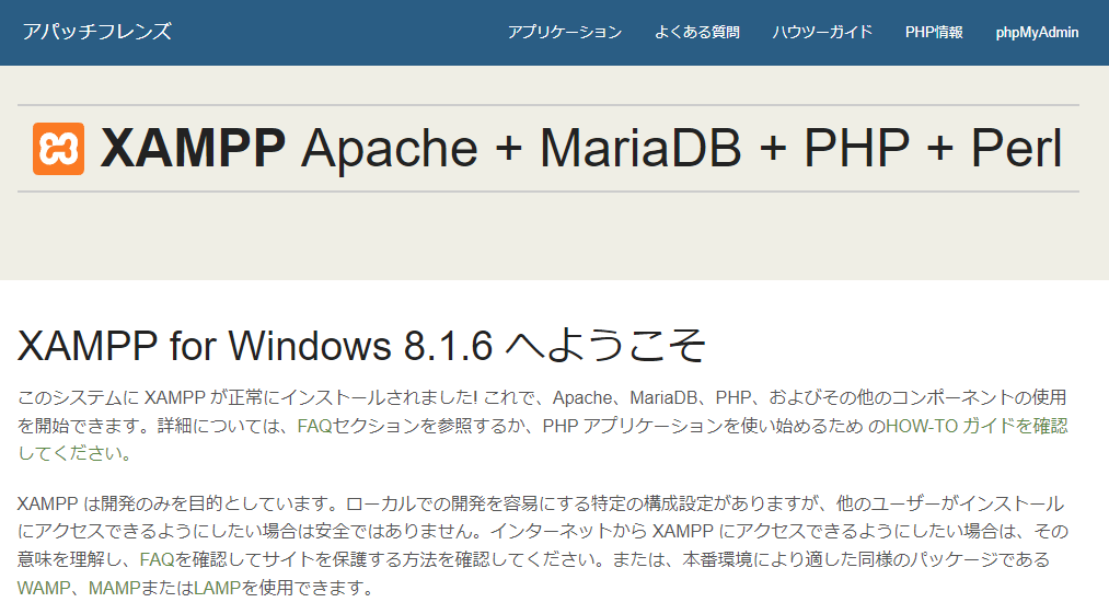 ZAMMP Control Panelを開き(勝手に開くかも)、ApacheをStartさせた状態で、ブラウザのアドレスバーに「localhost」と打って、次の画像のようなページが表示されたらインストール成功です。