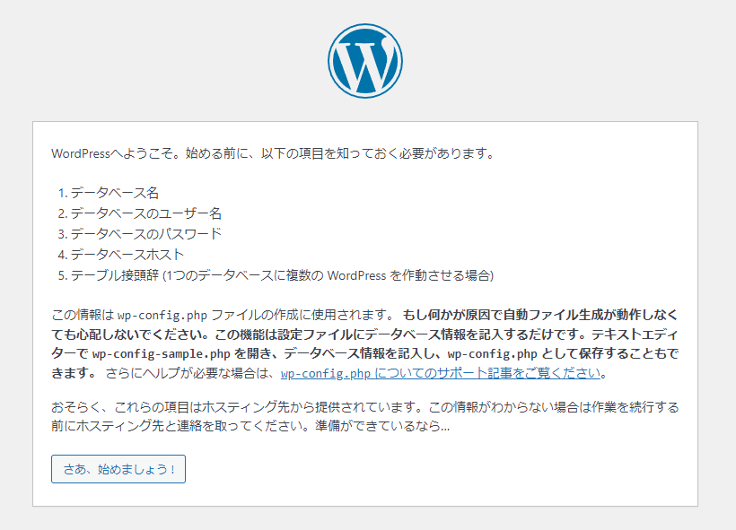 この状態でブラウザでローカルサーバーを表示させ、次の画像のように表示されれば、Wordpressのインストールが完了です。(Apacheの起動は忘れずに)